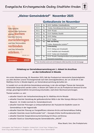 Am ersten Adventssonntag, 30. November 2025, lädt das Presbyterium interessierte Gemeindeglieder aus allen Bezirken unserer Kirchengemeinde nach dem Zentralgottesdienst, der um 10.30 Uhr in der Matthäus-Kirche in Weseke beginnt, zur Gemeindeversammlung dortselbst ein.